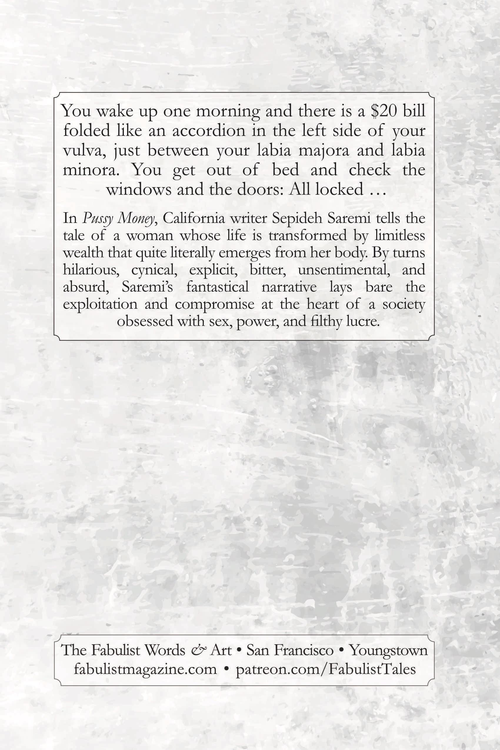 In Pussy Money, California writer Sepideh Saremi tells the tale of a woman whose life is transformed by limitless wealth that quite literally emerges from her body. By turns hilarious, cynical, explicit, bitter, unsentimental, and absurd, Saremi’s fantastical narrative lays bare the exploitation and compromise at the heart of a society obsessed with sex, power, and filthy lucre.